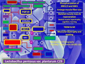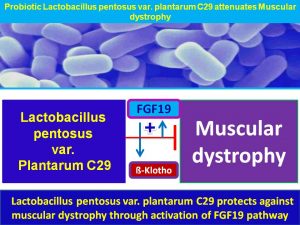 This study suggests, for the first time, that Probiotic Lactobacillus pentosus var. plantarum C29 may be used in the treatment of Muscle dystrophy. Probiotic Lactobacillus pentosus var. plantarum C29, by increasing the expression of its target genes, it may increase the expression of FGF19 and its receptor ß-Klotho (KLB) (Fig. 1). Thereby, it may: (1) increase the phosphorylation of ERK1/2 and S6K1; (2) enlarge muscle fiber size; (3) increase skeletal muscle mass; (3) promote skeletal muscle hypertrophy; (4) protect muscle from atrophy and muscle wasting. Thus, pharmacological formulations encompassing “Probiotic Lactobacillus pentosus var. plantarum C29, either alone or in combination with other drugs”, may be used to treat muscular dystrophy and wasting (fig.1).