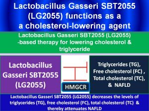 Figure 2. Probiotic Lactobacillus Gasseri SBT 2055 (LG2055) functions as a cholesterol-lowering agent. Lactobacillus Gasseri SBT 2055 (LG2055) lowers cholesterol and triglyceride levels and attenuates NAFLD through down-regulation of HMGCR