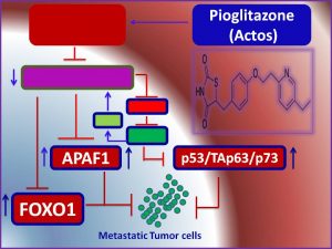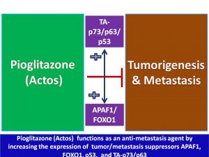 This study suggests that Pioglitazone (Actos), by increasing the expression of its target gene, it may increase the expression of tumor/metastasis suppressors genes, such as APAF1, Foxo1, p53, TA-p73, p53, INK4a/ARF and others. Thereby, it may inhibit the migration and invasion of metastatic cancer cells expressing mutant-p53 (figure1).