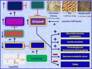 This study suggests, for the first time, an amino acid based therapy for TIIDM and metabolic defects. Leucine, by increasing the expression of its target gene, it may increase the expression of Sirtuin-4. Thereby, it may: (1) normalize leucine metabolism; (2) promote insulin secretion; (3) promote glucose homeostasis during ageing; and (4) decrease metabolic stress (Fig.1).