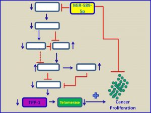 This study suggests that MiR-589 , by regulating the expression of its downstream target genes (Fig. 1), it may suppress the expression of Tripeptidyl Peptidase 1 (TPP1) and Telomerase (Fig 1). Remarkably, over 90% of the human tumors overexpress the cellular immortality gene telomerase, suggesting that inhibition of its activity may increase the efficacy of anticancer therapy.