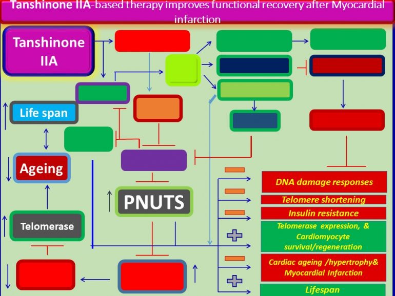 Tanshinone IIA, by increasing the expression of its target genes, it may increase the expression of PNUTS (fig.1). Thereby, it may: (1) inhibit DNA damage responses, (2) increase telomerase expression, (3) inhibit telomere shortening; (4) promote cardiomyocyte survival/regeneration/proliferation; (5) decelerate aging; and (6) extend lifespan (fig 1).