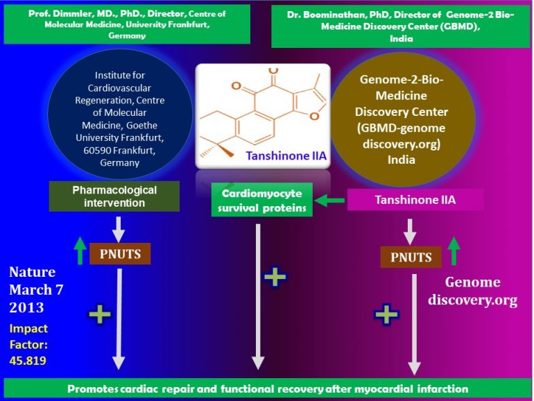 On the foundation of this interesting finding, Dr L Boominathan PhD, Director-cum-chief Scientist of GBMD, reports that: Tanshinone IIA-based regenerative cardiovascular therapy: Molecular mechanistic insight into how Tanshinone IIA protects against and promotes functional recovery after Myocardial Infarction: Tanshinone IIA, inhibits DNA damage responses, induces telomerase expression, inhibits telomere shortening, and promotes cardiomyocyte proliferation, regeneration and survival after myocardial infarction, via up-regulation of its target gene, 27/July/2020, 7.37 pm