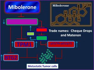 Given the ability of Mibolerone to induce the expression of a number of tumor/metastasis suppressor genes, it may be used, either alone or in combination with other anticancer drugs, to inhibit the progression of p53-mutated invasive metastatic tumors. Taken together, this study suggests, for the first time, that oncologists may consider treating metastatic cancer patients with Mibolerone, as it may stall the progression of advanced metastatic cancers. (figure 2).