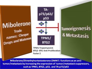 Figure 1. Mechanistic insight into how Mibolerone (Trade name: Cheque drops and Matenon) functions as an anticancer/antimetastatic agent in mutant p53-expressing tumors. Mibolerone (Trade name: Cheque drops and Matenon), by activating tumor/metastasis suppressor genes, such as TMP1, BTG2, p53, TAp63, TAp73, INK4a/ARF and others, in metastatic tumors, it may inhibit the progression of mutant-p53 expressing human cancers