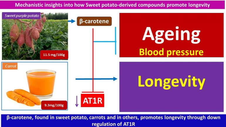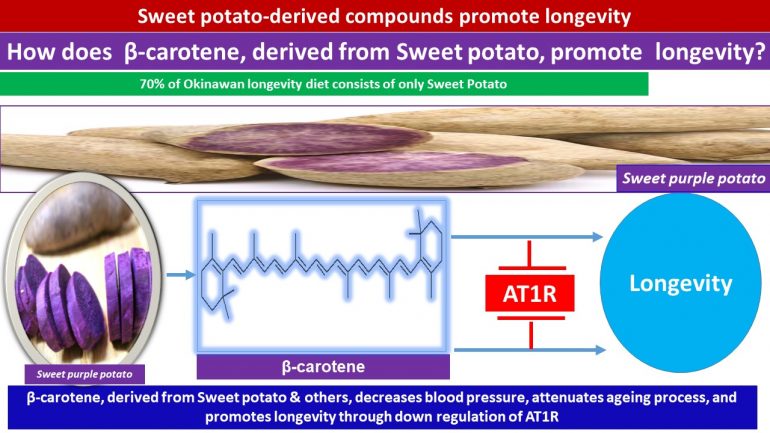 On the foundation of this interesting finding, Dr L Boominathan PhD, Director-cum-chief Scientist of GBMD, reports that: Mechanistic insights into how Okinawan longevity diet reduces blood pressure: Consuming ample amounts of Sweet potatoes will reduce blood pressure and extend lifespan: Sweet potato-derived compounds function as longevity promoters: ß-carotene, derived from sweet potatoes, decreases blood pressure and blood sugar levels, attenuates cardiac dysfunction, increases regeneration of tissues, and prolongs life span, via down regulation of angiotensin II type I receptor (AT1R)