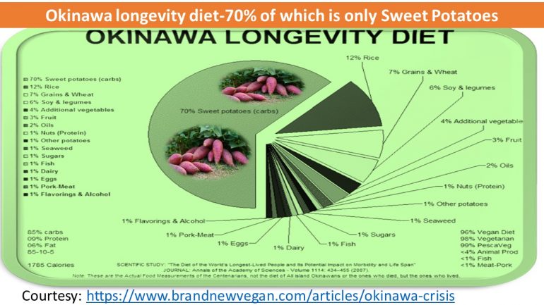 Figure 4. Okinawa longevity diet. The Okinawan diet depicted above highlights 70% of it consists only of sweet potatoes. ß-carotene is found abundantly in sweet potatoes compared with other vegetables.