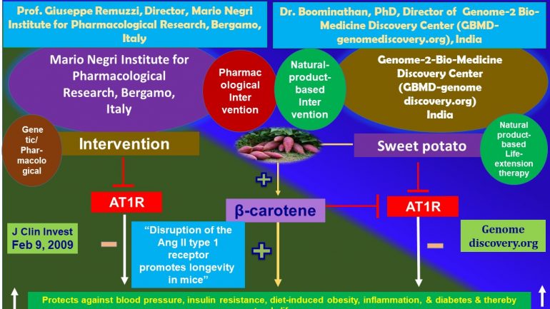 Citation: Boominathan, L., Mechanistic insights into how Okinawan longevity diet reduces blood pressure: Consuming ample amounts of Sweet potatoes will reduce blood pressure and extend lifespan: Sweet potato-derived compounds function as longevity promoters: ß-carotene, derived from sweet potatoes, decreases blood pressure and blood sugar levels, attenuates cardiac dysfunction, increases regeneration of tissues, and prolongs life span, via down regulation of angiotensin II type I receptor (AT1R), 5/January/2019, 2.50 pm, Genome-2-Bio-Medicine Discovery center (GBMD), http://genomediscovery.org