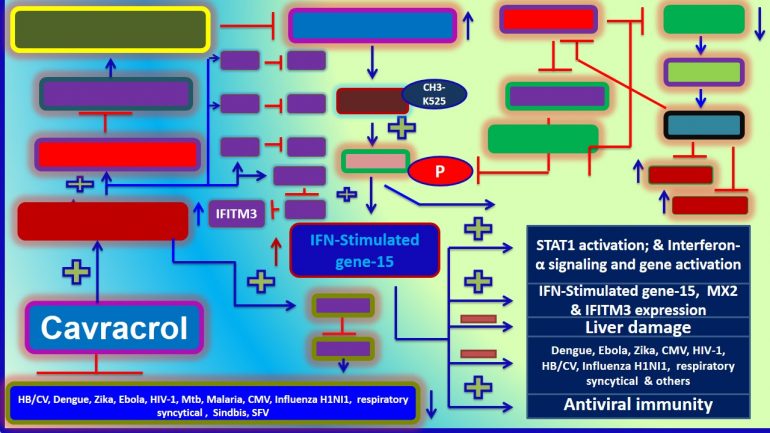 This study suggests, for the first time, that Carvacrol, by increasing the expression of its target genes, it may increase the expression of interferon-inducible transmembrane protein IFITM3, Interferon-stimulated gene-15, Mx2 and antimicrobial peptides. Thereby, it may: (1) inhibit the replication of Hepatitis-B/C, Dengue, Zika, Ebola, HIV-1, Mtb, Malaria, CMV, Influenza H1NI1, respiratory syncytial, Sindbis, and SFV viruses; (2) confer resistance against infection caused by Hepatitis-B/C, Dengue, Zika, Ebola, HIV-1, Mtb, Malaria, CMV, Influenza H1NI1, respiratory syncytical, Sindbis, and SFV viruses; and (3) promote innate immunity (Figure 1). Thus, pharmacological formulations encompassing “Carvacrol or its analogues, either alone or in combination with other drugs” may be used to prevent/treat infections caused by Hepatitis-B/C, Dengue, Zika, Ebola, HIV-1, Mtb, Malaria, CMV, Influenza H1NI1, respiratory syncytial, Sindbis, and SFV viruses (Figure 2).