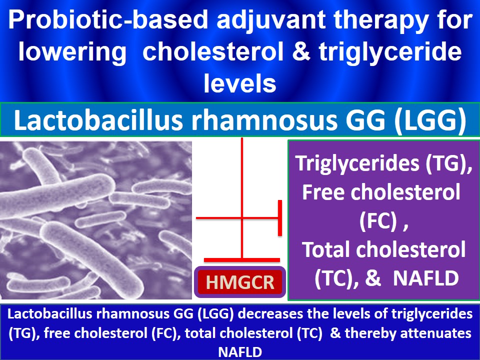 Probiotic-based therapy for lowering cholesterol, and triglycerides levels: Lactobacillus rhamnosus GG (LGG) decreases the levels of HMGCR,  triglycerides, free cholesterol, and total cholesterol and prevents the progression of Non-alcoholic fatty liver disease (NAFLD), via up-regulation of its target gene, 5/March/2019, 6.41 pm