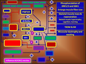 Influenza A/flu(H1N1) vaccine, by increasing the expression of its target genes, it may increase the expression of FGF19 and its receptor ß-Klotho (KLB) (Fig. 1). Thereby, it may: (1) increase the phosphorylation of ERK1/2 and S6K1; (2) enlarge muscle fiber size; (3) increase skeletal muscle mass; (3) promote skeletal muscle hypertrophy; (4) protect muscle from atrophy and muscle wasting. Thus, Influenza A/flu(H1N1) vaccine, either alone or in combination with other drugs”, may be used to treat muscular dystrophy and wasting (fig.1).