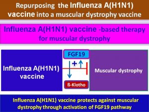This study suggests, first the first time, Influenza A/flu(H1N1) vaccine can be used in the treatment of muscular dystrophy and wasting. Influenza A (H1N1)-vaccine has been shown to protect against cardiovascular diseases, stroke, and others. However, the mechanism of action remains largely unknown.