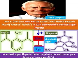 Figure 3. John B. (Iain) Glen, who won the 2018 Lasker Clinical Medical Research Award (America’s Nobel), discovered the anesthetic agent Propofol. Both Thiopental and Propofol function as anesthetic agents through induction of PD-L1.