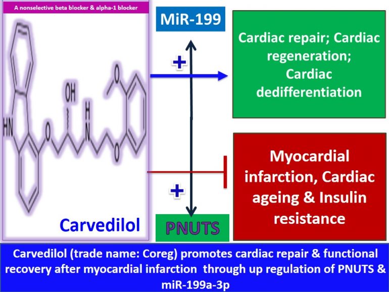 This study provides, for the first time, mechanistic insight into how vasodilatory beta-blocker Carvedilol protects against and promotes functional recovery after myocardial infarction. Though this drug is the 30th most prescribed drug in the US, its mechanistic of action is far from clear, especially as to how it protects against myocardial dysfunction. Intracardiac/epicardial injection of Carvedilol, by increasing the expression of its target genes, it may increase the expression of PNUTS, MiR-199-a-3p and others (fig.1) . Thereby, it may: (1) inhibit DNA damage responses, (2) increase telomerase expression, (3) inhibit telomere shortening; (4) promote cardiomyocyte repair/survival/dedifferentiation/regeneration; (5) decelerate aging; and (6) extend lifespan (fig 1).