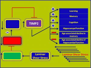 Laminar shear stress, by increasing the expression of its target genes, may increase the levels of TIMP2. Thereby, it may: (1) increase cognition and learning; (2) improve spatial memory; and (3) promote hippocampal function (fig.1).