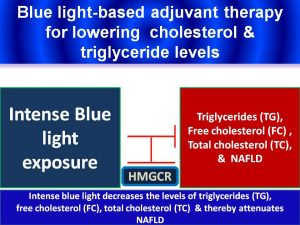 This study suggests, first the first time, a blue light-based therapy for lowering cholesterol and triglyceride levels and to treat Non-alcoholic fatty liver disease (NAFLD).