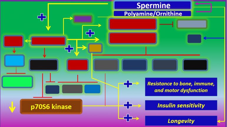Figure 2. Polyamine Spermine, by decreasing the expression of p70S6 Kinase, it increases insulin sensitivity, promotes resistance to bone, immune, and motor dysfunction, and extends lifespan.