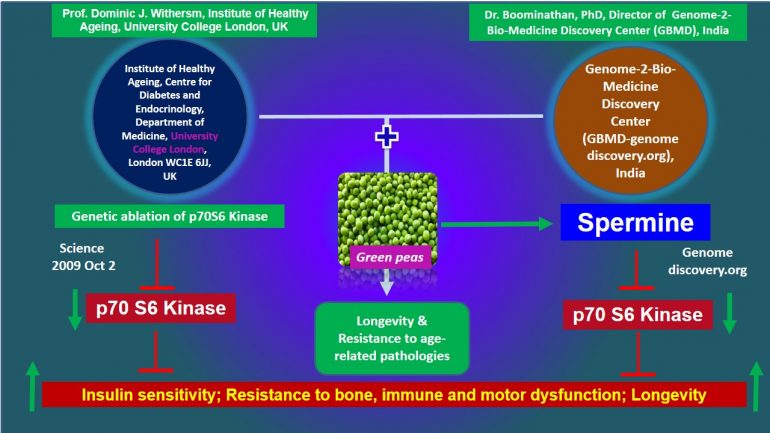 On the foundation of this interesting finding, Dr L Boominathan PhD, Director-cum-chief Scientist of GBMD, reports, for the first time, that: Live longer by consuming polyamine-rich foods: Spermine-based Lifespan extension therapy: Spermine, one of the polyamines, inhibits the expression of Ribosomal protein S6 kinase 1 (p70S6 Kinase) and extends mammalian lifespan by regulating the expression of its target genes