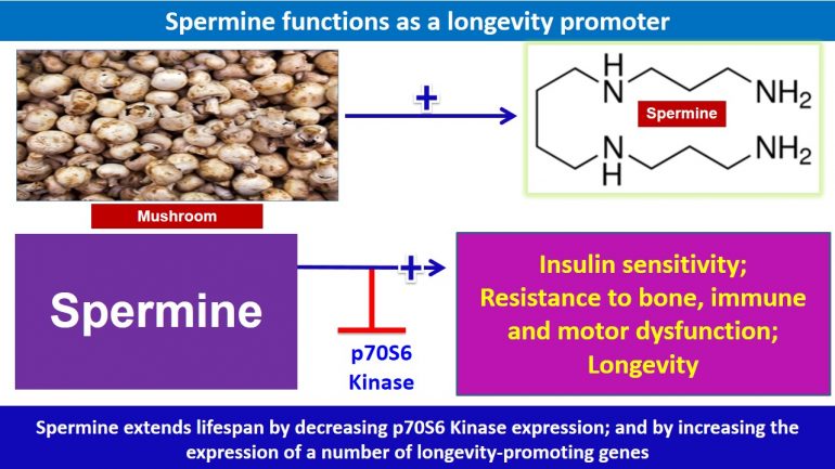 This study suggests, for the first time, with detailed mechanistic insights, Polyamine, such as Spermine may extend lifespan of humans. Spermine, by regulating the expression of its target gene, it may suppress Ribosomal protein S6 kinase 1 (p70S6 Kinase) expression and other genes (fig 1). Thereby, it may promote: (1) resistance to bone, immune, and motor dysfunction; (2) insulin sensitivity; and (3) longevity (figs. 2-5).