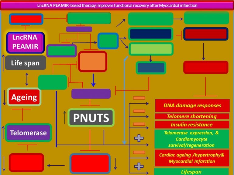 LncRNA PEAMIR, by decreasing the expression of its target genes, it could increase the expression of PNUTS (fig.1). Thereby, it may: (1) inhibit DNA damage responses, (2) increase telomerase expression, (3) inhibit telomere shortening; (4) promote cardiomyocyte survival/regeneration/proliferation; (5) decelerate aging; and (6) extend lifespan (fig 1).