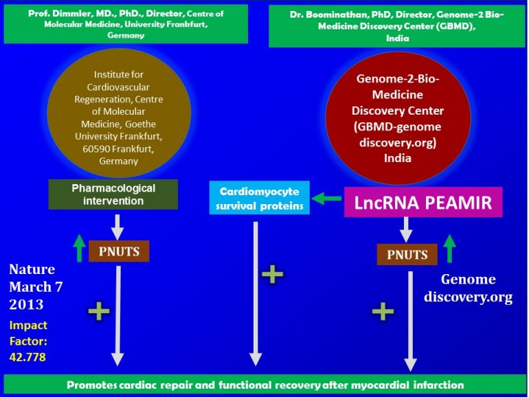 On the foundation of this interesting finding, Dr L Boominathan PhD, Director-cum-chief Scientist of GBMD, reports that: LncRNA-based regenerative cardiovascular therapy: LncRNA PEAMIR inhibits DNA damage responses, induces telomerase expression, inhibits telomere shortening, and promotes cardiomyocyte proliferation, regeneration, and survival after myocardial infarction, via up-regulation of its target gene