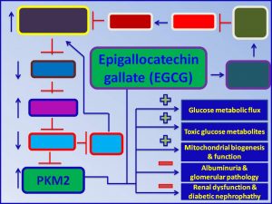 This study suggests, for the first time, that Epigallocatechin, by decreasing the expression of its target genes, it may increase the expression of Pyruvate kinase M2 (PKM2) (Fig 1). Thereby, it may: (1) decrease sulfenylation of PKM2 tetramer; (2) promote PKM2 tetramer formation; (3) reduce toxic glucose metabolites, mitochondrial dysfunction and apoptosis; (4) increase glycolytic flux and PGC-1α levels; (5) improve metabolic abnormalities, mitochondrial dysfunction, albuminuria and glomerular pathology; (6) ameliorate Diabetic nephropathy (DN)-associated pathophysiologies; and (7) improve renal dysfunction (Fig.1).