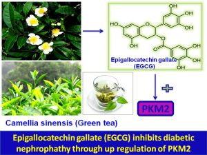 MMolecular therapy for Diabetic nephropathy (DN): Epigallocatechin (EGCG), isolated from Green tea, increases Pyruvate kinase M2 (PKM2) expression, decreases toxic glucose metabolites, mitochondrial dysfunction and apoptosis, augments glycolytic flux and PGC-1α levels, improves metabolic abnormalities, albuminuria, glomerular pathology, and renal dysfunction and alleviates diabetic nephropathy via down regulation of its target gene, 25/January/2018, 12.33 am