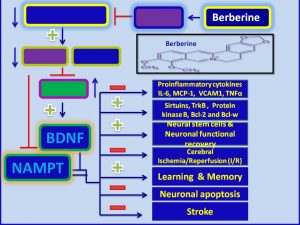 This study suggests that Berberine, by increasing the expression of of its target genes, it may: (1) increase the expression of BDNF and NAMPT (Nicotinamide Phosphoribosyltransferase-Nicotinamide Adenine Dinucleotide); (2) augment neuronal–BDNF-TrkB-PI3K/Akt–survival pathway; (3) increase Sirtuins expression; (4) enhance neural stem cells; (5) promote neural functional recovery; (6) attenuate cerebral /Ischemia reperfusion injury; (7) inhibit neuronal apoptosis; (8) improve learning and memory; and (9) attenuate neurological deficits (Figs.1-2). [easy_payment currency=”USD”]
