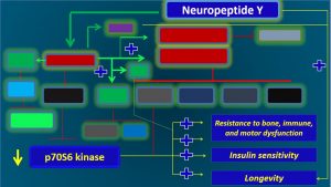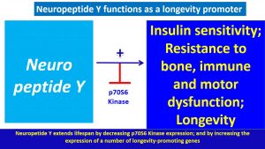 This study provides mechanistic insights into how Neuropeptide Y (NPY) functions as a longevity-promoting agent. Neuropeptide Y (NPY), by increasing the expression of its target gene, it may suppress Ribosomal protein S6 kinase 1 (p70S6 Kinase) expression. Thereby, it may promote: (1) resistance to bone, immune, and motor dysfunction; (2) insulin sensitivity; and (3) longevity (fig. 1).