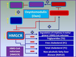 This study suggests an Oxyntomodulin (OXM)-based therapy for lowering cholesterol and triglyceride levels, and to treat Non-alcoholic fatty liver disease (NAFLD). Oxyntomodulin (OXM), by increasing the expression of its rtrget gene, it may suppress the expression of HMGCR (Fig.1). Thereby, it may: (1) decrease Triglycerides, free cholesterol, and total cholesterol levels; (2) attenuate lipid deposition in the liver; and (3) inhibit progression to NAFLD (Fig. 1). Thus, a pharmaceutical formulations encompassing Oxyntomodulin (OXM) or its activators, either alone or in combination with other drugs, may be used to treat NAFLD (Fig.2).