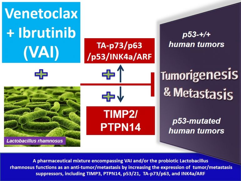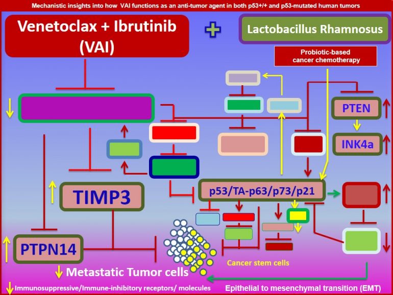 Figure 3. A pharmacological formulation encompassing Vinetoclax/ABT-199, & Ibrutinib (VAI) and probiotic Lactobacillus rhamnosus” may attenuate the progression of advanced cancers through induction of tumor/metastatic suppressors, such as TIMP3, PTPN14, p53, TAp73/p63, INK4a, p19ARF and others