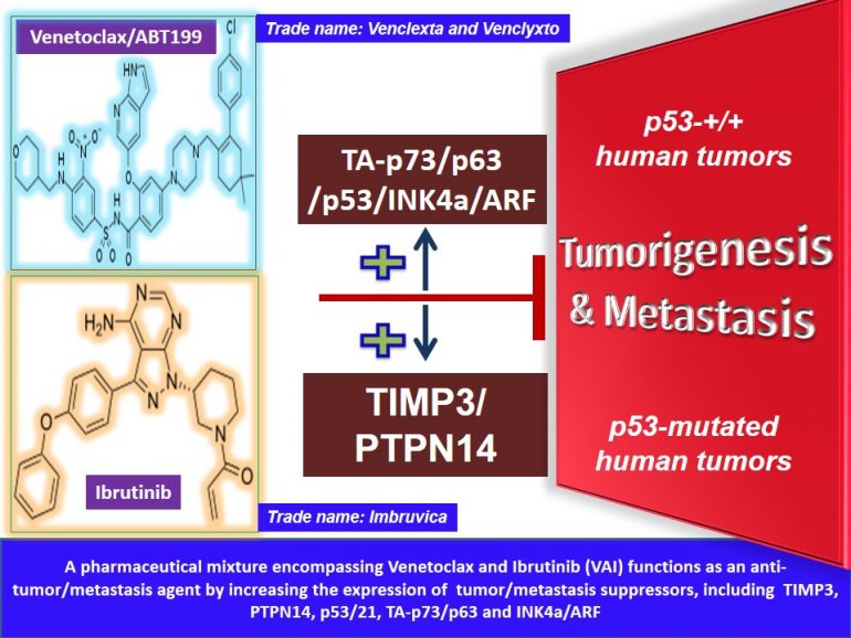 Figure 1. Mechanistic insights into how a pharmacological formulation encompassing Vinetoclax/ABT-199, & Ibrutinib (VAI) increases the expression of tumor/metastatic suppressors, such as TIMP3, PTPN14, p53, TAp73/p63, INK4a, p19ARF and others.