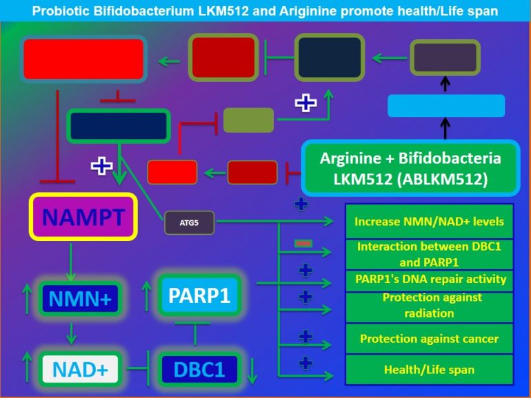 Figure 2. A therapeutic mix encompassing Probiotic Bifidobacterium LKM512 and Arginine (ABLKM512) promotes health/lifespan by increasing the levels of NAD+.