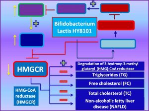 Bifidobacterium lactis HY8101, by increasing the expression of its target gene, it may suppress the expression of HMGCR (Fig.1). Thereby, it may: (1) decrease Triglycerides, free cholesterol, and total cholesterol levels; (2) attenuate lipid deposition in the liver; and (3) inhibit progression to NAFLD (Fig. 1). Thus, Lactobacillus fermentum DR9 (LF-DR9), either alone or in combination with other drugs, may be used to treat NAFLD.