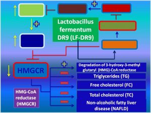Lactobacillus fermentum DR9 (LF-DR9), by increasing the expression of its target gene, it may suppress the expression of HMGCR (Fig.1). Thereby, it may: (1) decrease Triglycerides, free cholesterol, and total cholesterol levels; (2) attenuate lipid deposition in the liver; and (3) inhibit progression to NAFLD (Fig. 1). Thus, Lactobacillus fermentum DR9 (LF-DR9), either alone or in combination with other drugs, may be used to treat NAFLD.