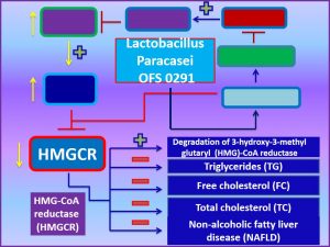 Probiotic Lactobacillus Paracasei OFS 0291 (LP-0291), by increasing the expression of its target gene, it may suppress the expression of HMGCR (Fig.1). Thereby, it may: (1) decrease Triglycerides, free cholesterol, and total cholesterol levels; (2) attenuate lipid deposition in the liver; and (3) inhibit progression to NAFLD (Fig. 1). Thus, probiotic Lactobacillus Paracasei OFS 0291 (LP-0291), either alone or in combination with other drugs, may be used to treat NAFLD.
