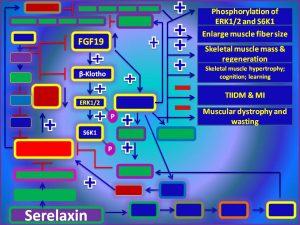This study suggests that the drug Serelaxin, a recombinant relaxin-2, used in the treatment of acute heart failure (AHF) may in the treatment of Muscle dystrophy. Serelaxin, by increasing the expression of its target genes, it may increase the expression of FGF19 and its receptor ß-Klotho (KLB) (Fig. 1). Thereby, it may: (1) increase the phosphorylation of ERK1/2 and S6K1; (2) enlarge muscle fiber size; (3) increase skeletal muscle mass; (3) promote skeletal muscle hypertrophy; (4) protect muscle from atrophy and muscle wasting. Thus, pharmacological formulations encompassing “Serelaxin or its analogs, either alone or in combination with other drugs”, may be used to treat muscular dystrophy and wasting (fig.1).