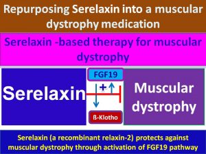 This study suggests that the drug Serelaxin, a recombinant relaxin-2, used in the treatment of acute heart failure (AHF) may in the treatment of Muscle dystrophy. Serelaxin, by increasing the expression of its target genes, it may increase the expression of FGF19 and its receptor ß-Klotho (KLB) (Fig. 1). Thereby, it may: (1) increase the phosphorylation of ERK1/2 and S6K1; (2) enlarge muscle fiber size; (3) increase skeletal muscle mass; (3) promote skeletal muscle hypertrophy; (4) protect muscle from atrophy and muscle wasting. Thus, pharmacological formulations encompassing “Serelaxin or its analogs, either alone or in combination with other drugs”, may be used to treat muscular dystrophy and wasting (fig.1).