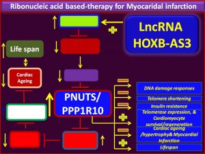 Ribonucleic acid-based therapy for Myocardial Infarction: LncRNA Hoxb-AS3 inhibits DNA damage responses, induces telomerase expression, inhibits telomere shortening, and promotes cardiomyocyte survival after myocardial infarction, via up-regulation of PNUTS, 9/January/2019, 12.01 am