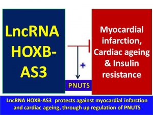 LncRNA Hoxb-AS3 , by increasing the expression of its target genes, it may increase the expression of PNUTS (fig.1). Thereby, it may: (1) inhibit DNA damage responses, (2) increase telomerase expression, (3) inhibit telomere shortening; (4) promote cardiomyocyte survival/regeneration; (5) decelerate aging; and (6) extend lifespan (fig 1).  Together, this study suggests that pharmacological formulations encompassing LncRNA Hoxb-AS3, either alone or in combination with other drugs,”  may be used to improve cardiac function after myocardial infarction (fig. 2).