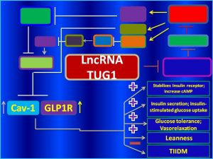 Figure 2. LncRNA TUG1 or its activators may function as anti-diabetic agents. LncRNA TUG1 increases CAV1 and GLP-IR through upregulation of its target gene
