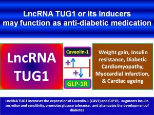 On the foundation of this interesting finding, Dr L Boominathan PhD, Director-cum-chief Scientist of GBMD, reports that: RNA-based therapy for Diabetes: LncRNA TUG1 increases GLP1R and Caveolin-1 (CAV-1) expression, promotes glucose-induced insulin secretion, improves insulin sensitivity, increases energy utilization, promotes weight loss and protects from diet-induced obesity and TIIDM, via up-regulation of its target gene