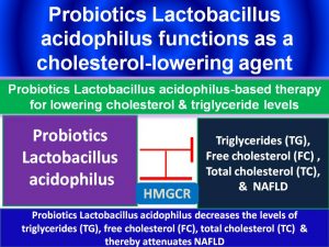 Figure 1. Mechanistic insights into how Probiotic Lactobacillus acidophilus decreases the expression of HMGCR, lowers cholesterol levels, decreases triglyceride levels, and NAFLD.
