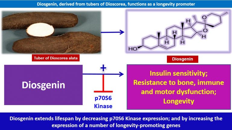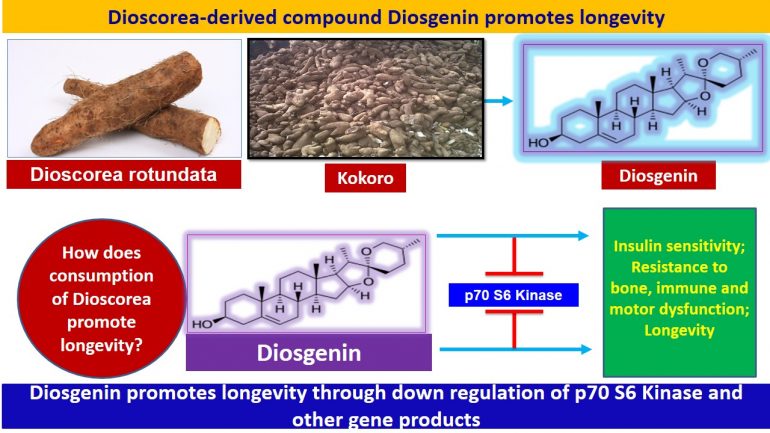 This study suggests, for the first time, with detailed mechanistic insights, that Dioscorea, and its components, such as Diosgenin may extend the lifespan of humans. Diosgenin, by regulating the expression of its target gene, it may suppress the expression of Ribosomal protein S6 kinase 1 (p70S6 Kinase). Thereby, it may promote: (1) resistance to bone, immune, and motor dysfunction; (2) insulin sensitivity; and (3) longevity (fig. 1).