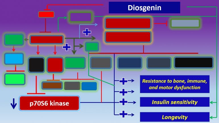Figure 4. Figure 3. While genetic ablation of p70S6 Kinase extends lifespan, the studied presented here suggests that Diosgenin, by decreasing the expression of p70S6 Kinase, it increases insulin sensitivity, promotes resistance to bone, immune, and motor dysfunction, and extends lifespan.